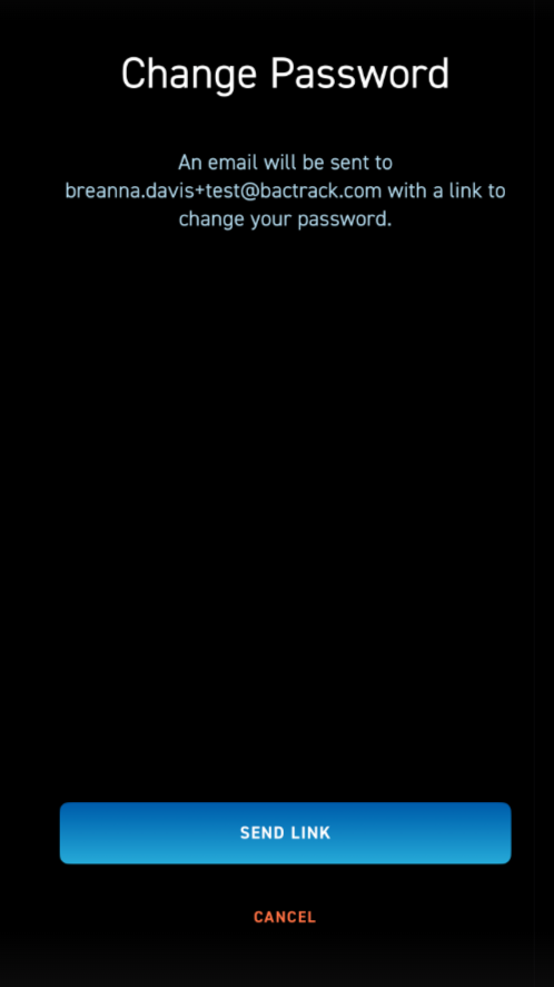 - The next setting option is CHANGE PASSWORD. As noted on the screen, you will click the blue SEND LINK button at the bottom and we will email you a link to reset your password. If you entered this screen in error, you can click CANCEL to exit and go back to the settings menu.