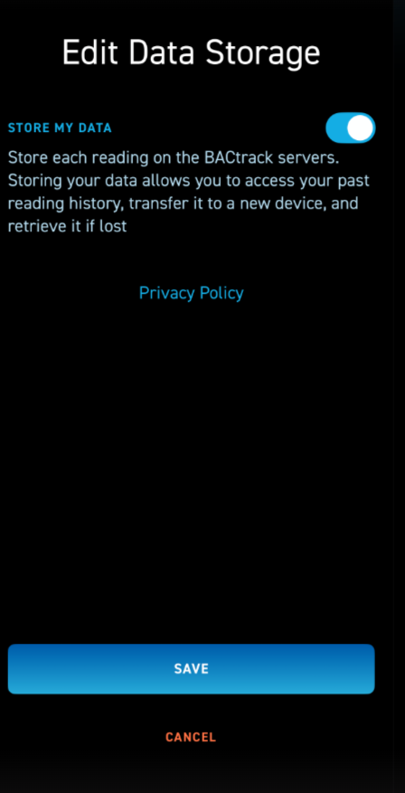 - The third setting option is DATA STORAGE SETTINGS. Here you can enable or disable the feature to store your data. Storing your data allows you to access your past reading history, transfer it to a new device, and retrieve it if lost. Once you change the setting, you can click the blue SAVE button at the bottom.