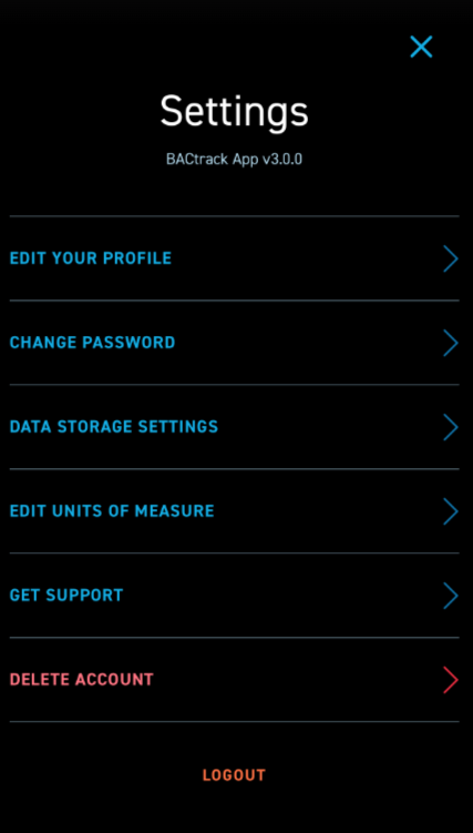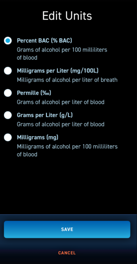 - The fourth setting option is EDIT UNITS OF MEASURE. On this screen, you can select the unit that matches the standard used in your country or personal preference. Once selected, your test results will be displayed using that measurement format. The default in the U.S. is Percent BAC (% BAC). Once you select the correct unit of measurement, click the blue SAVE button at the bottom.